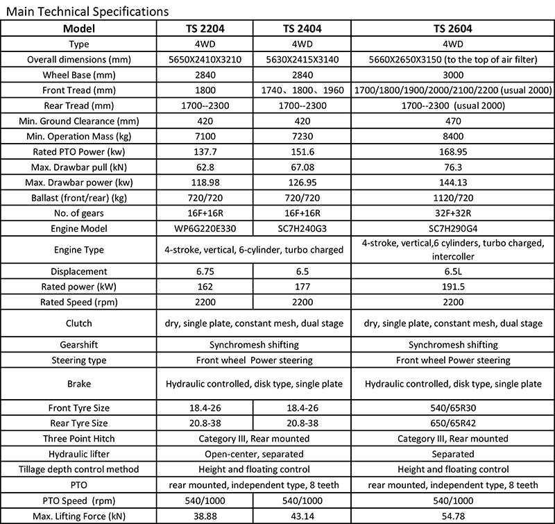 6 cylinder national III Engine, TS reinforced chassis, 32F+32R synchronizer shuttle-type shift gear, imported Germany LUK clutch, Creeper gear, Power steering, clutch hydraulic power assist control system, chassis hydraulic cooling system, step-up fuel tank,luxury air-conditioning cab, reversing integrated new instrument system,luxury instrument desk with adjustable steering wheel, Grammer seat, 4 groups of hydraulic output (four sets of hydraulic output is optional),power output 540/1000 minutes (760/850,760/1000 revolution/minute are optional), Electric Control , Three point linkage with Catalogue III hooks.