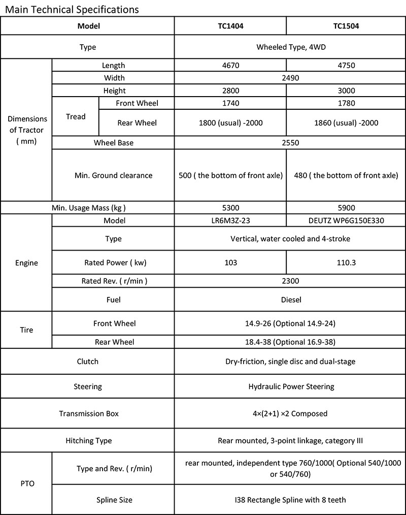 6 cylinder national III Engine, TC double-reinforced chassis, 16F+8R gear, 14-inch German LUK clutch is optional, Creeper gear, Power steering, chassis cooling system, clutch hydraulic power assist control system, luxury air-conditioning cab, reversing integrated new instrument system, luxury instrument desk with adjustable steering wheel, 3 groups of hydraulic output, power output 540/1000(760/850,760/1000 are optional) revolution/minute, Three point linkage with Catalogue III hooks.